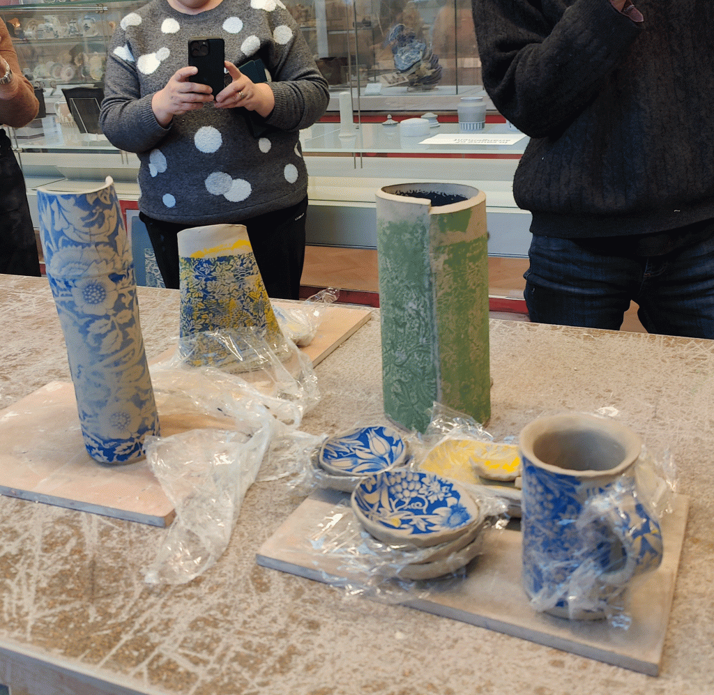 Some examples of the unfired learning pieces using V&A museum designs on pre-course prepared screens are in the blog for interest.