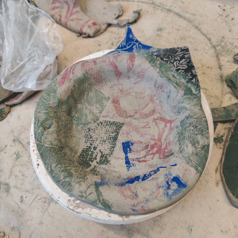 The museum has a huge and extensive collection of ceramics and this gallery houses not only Lucie Rie’s studio, but also a working ceramics studio. So going on a clay screen printing course with Banu Bal, ceramic artist, was something Mike didn’t want to miss and it proved a very enjoyable day building clay printing skill. The location in the gallery means that many gallery visitors just get fascinated watching people make with clay, but although Mike doesn’t usually like to be watched when doing, with other adept course participants it made the workshop more fun.